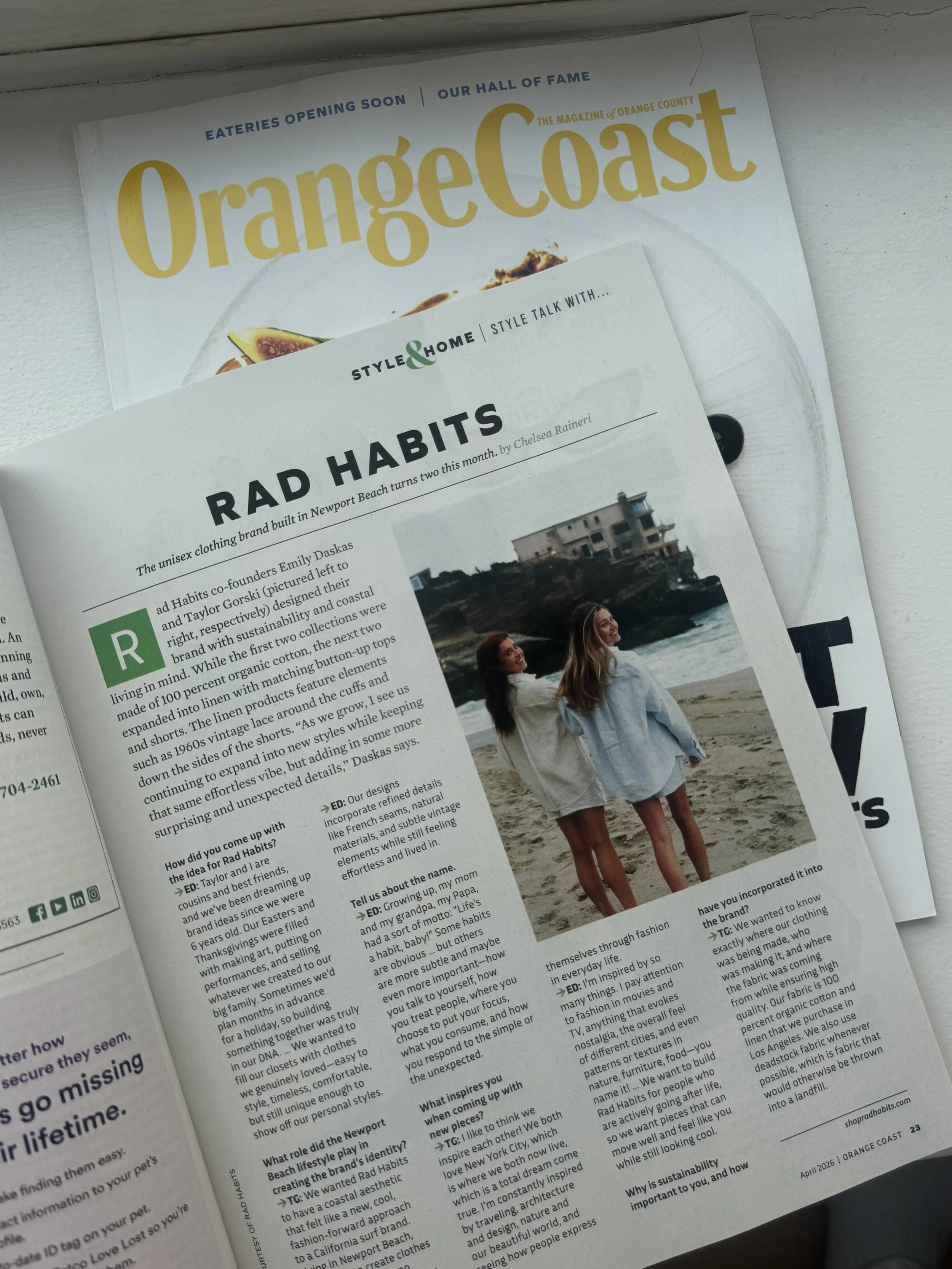 In The PressRad Habits Press Features For press inquires please email taylor@shopradhabits.com Orange Coast MagazineApril 2026 PrintRad Habits Feature DarlingDecember 2025 Gift GuideRad Habits Inclusion